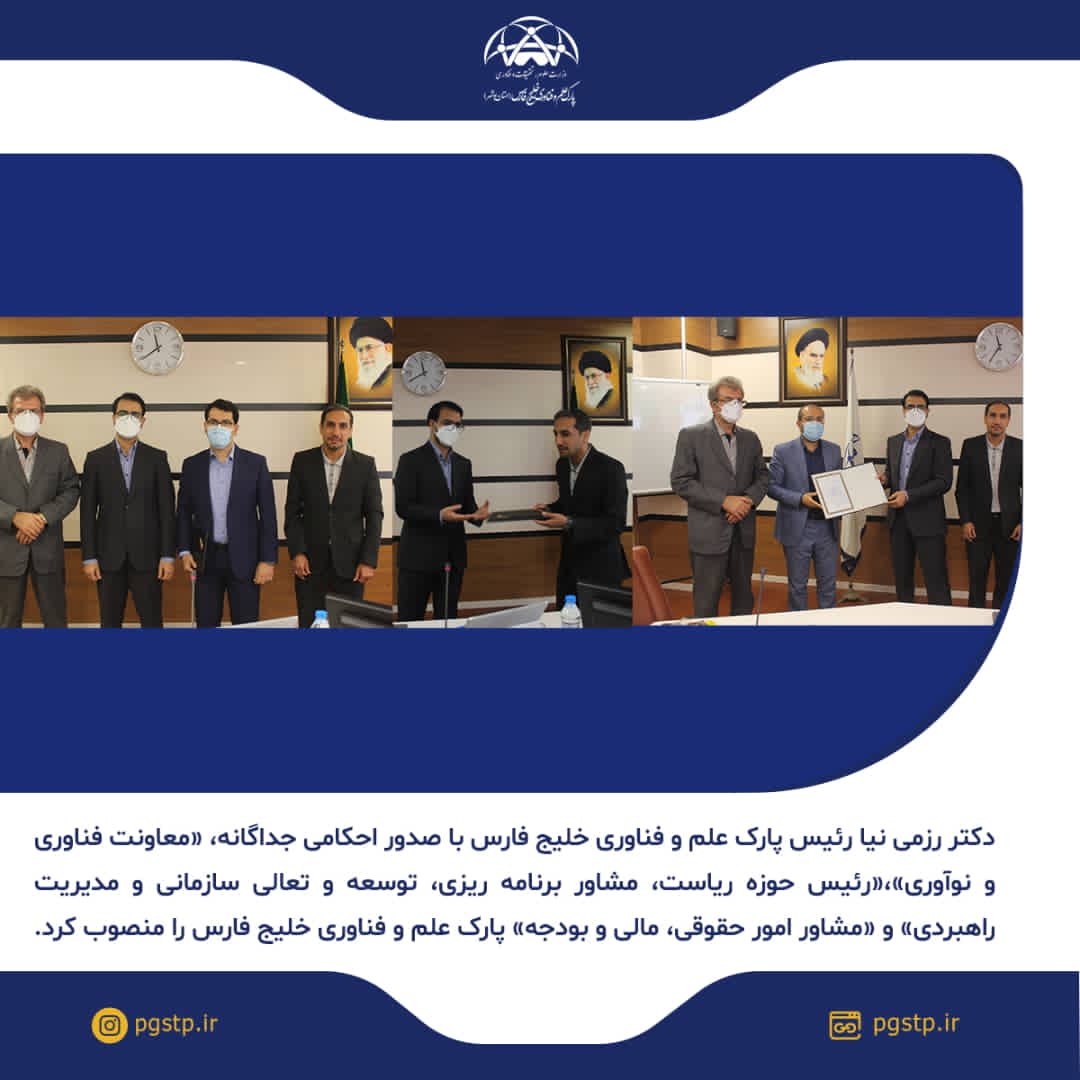 به گزارش روابط عمومی پارک علم و فناوری خلیج فارس، دکتر ابوالحسن رزمی نیا، رئیس پارک علم و فناوری خلیج فارس در احکامی جداگانه، عبدالحسن بهرامی را به سمت معاونت فناوری و نوآوری، سید علی جعفری را به سمت رییس حوزه ریاست، روابطعمومی و امور بین الملل و مشاور برنامه ریزی، توسعه و تعالی سازمانی و مدیریت راهبردی و مهدی علوی نژاد را به سمت مشاور حقوقی، مالی و بودجه پارک علم و فناوری خلیج فارس منصوب کرد.