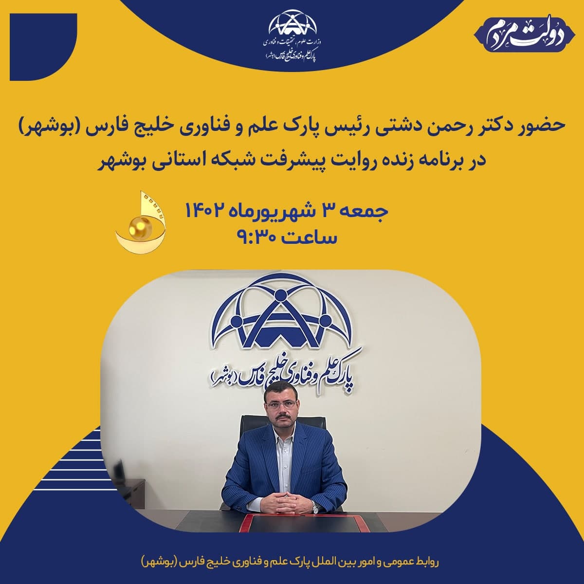 حضور دکتر رحمن دشتی رئیس پارک علم و فناوری خلیج فارس(بوشهر) در برنامه زنده روایت پیشرفت پخش از شبکه استانی بوشهر