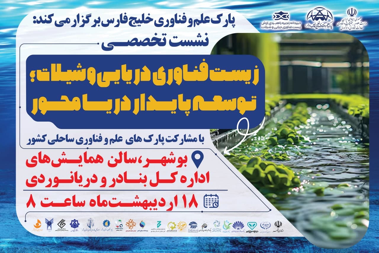 بر پایه این گزارش، نشست تخصصی «زیستفناوری دریایی و شیلات؛ توسعه پایدار دریا محور» توسط معاونت فناوری و نوآوری وزارت علوم، تحقیقات و فناوری و با همکاری و به میزبانی پارک علم و فناوری خلیج فارس بوشهر برگزار خواهد شد.