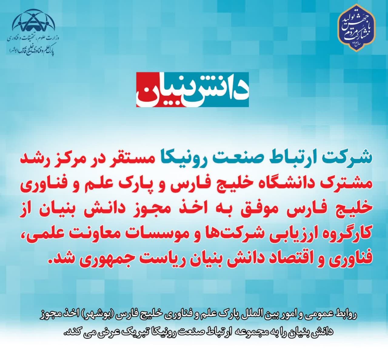 به گزارش روابط عمومی پارک علم و فناوری خلیج فارس، شرکت ارتباط صنعت رونیکا مستقر در مرکز رشد مشترک دانشگاه خلیج فارس و پارک علم و فناوری خلیج فارس موفق به اخذ مجوز دانش بنیان از کارگروه ارزیابی شرکتها و مؤسسات معاونت علمی، فناوری و اقتصاد دانش بنیان ریاست جمهوری شد.
