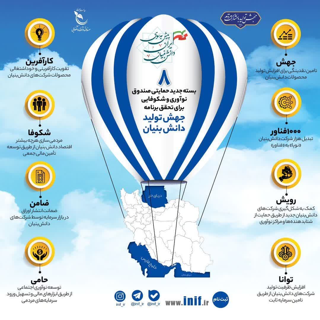 صندوق نوآوری و شکوفایی در راستای تحقق شعار سال در نظر دارد به منظور جهش تولید و فروش شرکتهای دانشبنیان و تقویت اثرگذاری آنها در اقتصاد کشور، برنامه جهش تولید شرکتهای دانشبنیان را با هدف افزایش فروش این شرکتها به شرح این فراخوان اجرا کند.